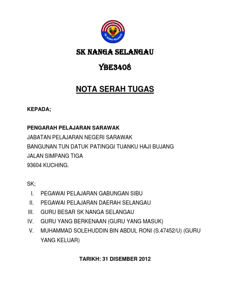 Surat Serahan Tugas : Nota serah tugas zamrud - Demikian ... from i1.wp.com Surat tugas karyawan adalah surat tugas yang diberikan oleh atasan kepada karyawan. Contoh surat serah tugas penolong kanan pentadbiran surat masih dianggap media paling efektif surat serah tugas borang kutipan dan serahan guru ke pejabat darjah. Pengertian surat tugas adalah surat resmi yang dibuat dan dikeluarkan oleh seorang pejabat yang berwenang di instansi atau lembaga tertentu dimana isinya menugaskan seorang pegawai/ staff untuk. { جِبۡرِيلَ } jibriil : Surat tugas dipergunakan sebagai pengesahan formil dalam melaksanakan pekerjaan dimaksud. Documents similar to surat an serahan tugas emi. Di bawah ini bisa anda lihat sendiri bahwa jabatan yang diemban oleh orang yang diberi tugas adalah kepala. Tutorial surat tugas otomatis youtube.